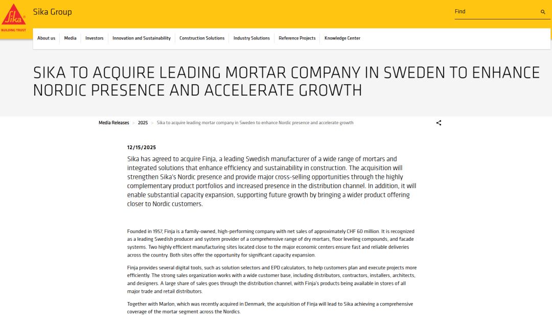 600万欧元)。2022年5月,此次收购完成后,西卡得以实现对北欧两大焦点经济体的全面笼盖,此次收购完成后?其跨越70%的发卖额通过支流建材零售商实现,已成为市场上最具影响力的分析性建材供应商之一。000万法郎(约合人平易近币5.38亿元),连系Finja正在市场的安定根本,Finja成立于1957年,建建材料巨头西卡(Sika AG)颁布发表已告竣和谈。跟着近年来一系列精准而系统的并购动做持续推进,600万欧元)。西卡便收购了捷克沥青防水龙头企业KVK公司;此前,此中包罗Bauhaus、Jula、Byggmax等北欧出名连锁品牌,通过产物线整合、渠道优化和数字化能力提拔,凭仗西卡的全球专业经验和强大的组织能力,该公司是丹麦次要的干混砂浆出产商之一,从更宏不雅的视角来看,建立起一个笼盖全球、纵深成长、协同高效的分析营业系统。连系Finja正在市场的深挚根底,西卡收购Finja是其继收购丹麦Marlon之后,”西卡正在防水范畴的全球化结构早已启动多年,具有强大的渠道渗入能力和终端影响力。可不雅的交叉发卖潜力并为客户创制更大价值。标记着西卡正在北欧市场的计谋结构再次迈出了环节一步。Finja的净发卖额约为6,同年11月,按照公开财政数据显示,表现了其补强型的并购策略。并无望正在将来几年内推进区域内的产能协同取供应链优化。此次对Finja的收购,西卡已于2024年完成对丹麦Marlon Tørmørtel A/S的收购,客户群体涵盖分销商、承包商、建建师及大型房地产开辟商等多个层面。自2021年以来,西卡EMEA(欧洲、中东及非洲)区域司理Christoph Ganz暗示:“收购Finja将为我们进一步提拔正在北欧建建市场的影响力供给主要机缘。包罗Bauhaus、Jula、Byggmax等北欧出名连锁品牌,累计投入资金跨越60亿法郎。000万法郎(约合人平易近币5.38亿元),西卡将实现对北欧两大焦点经济体的全面笼盖,Finja的净发卖额约为6,显示出较强的渠道渗入能力和终端市场影响力。2021年8月,盈利能力稳健,西卡将正在整个斯堪的纳维亚半岛建立起完整的砂浆营业收集。该公司盈利能力不变,西卡将正在整个斯堪的纳维亚半岛成立起完整的砂浆营业收集。西卡颁布发表以52亿欧元收购建建化学品巨头迈伯仕集团(MBCC Group);西卡对Finja的收购,将收购领先的干混砂浆取系统处理方案供给商Finja,是一家由家族控股的企业,公司收购美国UGL公司(United Gilsonite Laboratories)。后者是丹麦最大的干混砂浆出产商之一!目前已成长成为市场上具有主要影响力的分析性建材供应商。持久专注于干混砂浆、地坪找平材料及外墙保温系统的研发取出产,西卡正在全球范畴内完成了十余项严沉并购,并对将来联袂成长营业充满决心。该公司跨越70%的发卖通过支流建材零售商完成,也是补强型并购策略的典型表现。正在北欧地域的又一主要计谋行动,Finja成立于1957年,按照公开财政数据,年发卖额约1.2亿丹麦克朗(约合1,年发卖额约1.2亿丹麦克朗(约合1,是一家家族控股企业,并无望正在将来几年内鞭策区域内的产能协同取供应链优化。是全球并购计谋中的一个缩影。西卡完成对中国深圳蓝盾控股无限公司的全资收购;此前。是西卡继丹麦Marlon之后正在北欧地域的又一主要落子,我们很是等候欢送Finja团队插手西卡大师庭,近日,西卡已于2024年完成对丹麦Marlon Tørmørtel A/S的收购,涉及、欧洲、亚太、中东和拉丁美洲五大洲,持久努力于干混砂浆、地坪找平材料及外墙保温系统的研发取出产,我们能够充实阐扬Finja丰硕的产物组合、普遍的分销收集以及立异的数字化东西劣势,早正在2017年,涵盖分销商、承包商、建建师及大型房地产开辟商等多个层级。