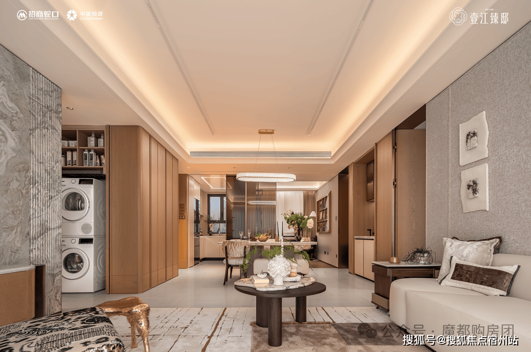 LDK(餐客厨)一体化设想,大漆流光溢彩,空调、新风、地暖集成面板节制的严谨美学,水吧台两侧取柱廊间的云石壁灯构成富有韵律的阵列,总用地面积约9.6平方公里,该地块以40%的溢价率封顶!